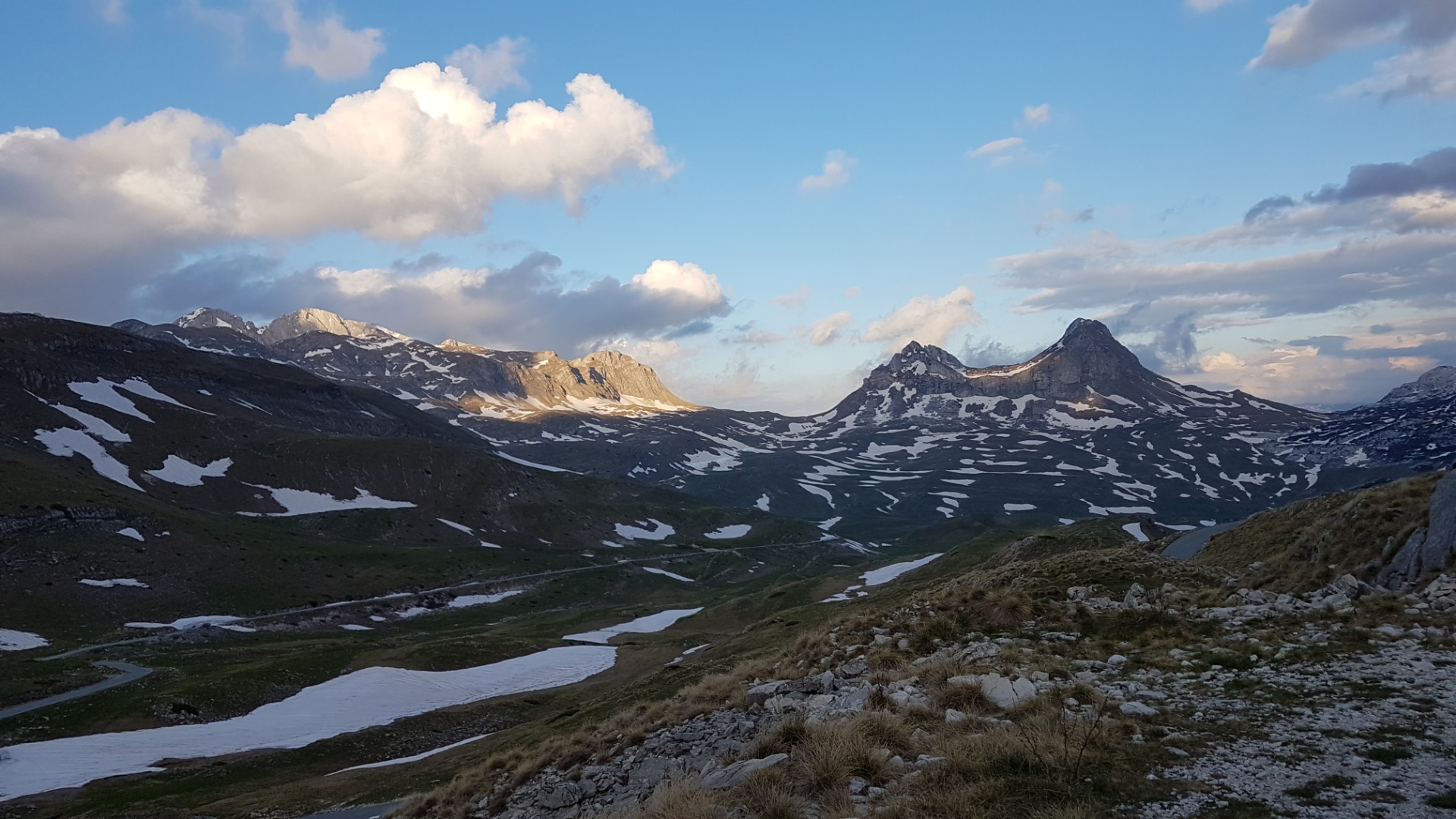 Nach zwei Stunden sind wir zurück am Bus und steuern für die Nacht einen Schlafplatz an, der mitten im Durmitor am Rande der Straße P14 liegt, die sich von Süd nach Nord durch den Park und dann weiter bis zu bosnischen Grenze zieht. Der Crno Jezero liegt auf etwa 1.300 Metern, ab da geht es für uns nur noch bergauf. Je höher wir kommen, desto karger wird die Landschaft. Vom Abendlicht werden die schroffen Felshänge und die von weißen Gesteinsbrocken durchzogenen Wiesen sanft gestreichelt. Überall an den Felsen krallt sich noch alter Schnee fest. Es wird von Höhenmeter zu Höhenmeter kühler. Wir überqueren den Sedlo-Pass auf 1.900 Metern – der höchste Punkt für heute. Dahinter hat sich der alte Schnee bis an die schmale P14 hergeschoben und türmt sich rechts und manchmal auch rechts und links übermannshoch neben uns auf. Mehr als einmal berühren wir mit dem Seitenspiegel beinahe die Schneewand. Als wir an dem Platz ankommen, an dem wir schlafen wollen, liegt der komplett unter einem alten Schneefeld. Nico fragt, ob wir zurück zum Pass wollen, wo mehr als genug Platz für unseren Bus gewesen wäre. Aber mir behagt die karge, abweisende, kühle Atmosphäre in dieser Höhe nicht so recht. In der Abendsonne ein Traum, aber nach Sonnenuntergang? Wir fahren weiter. Und finden auf 1.500 Metern, inmitten von wieder deutlich üppigerer Natur und im goldenen Licht der hinter den Bergen verschwindenden Sonne, einen schönen Platz für die Nacht.