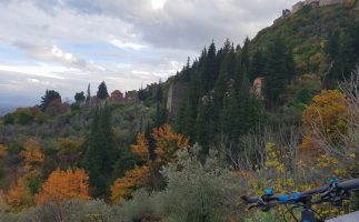 Vor allem aber haben wir versucht, jeden Tag ein bisschen vor die Tür zu kommen – was letzte Woche eine echte Herausforderung an unsere Regenkleidung war: Vier Tage am Stück hat es ohne Unterlass geschüttet. Immerhin ist es spektakuläres Mistwetter: Die Gipfel des Taygetos hüllen sich in dramatische Nebelfetzen, die Wolken über der Ebene von Sparta ballen sich in 50 Shades fo Grey am Himmel, der Regen verschleiert die Ruinen von Mystras und tropft von den Oliven- und Orangenbäumen vor unserem Haus. Es riecht schon mittags nach Kaminfeuer. Nichts wie raus, zu Fuß und endlich auch mal mit dem Mountainbike. Wir können es uns leisten, nass und dreckig zu werden: Im warmen Haus mit viel Platz zum Sachenaufhängen und einer Waschmaschine wird schnell alles wieder trocken und sauber. Wir nach einem heißen Bad auch – im Bus wäre das deutlich schwieriger.