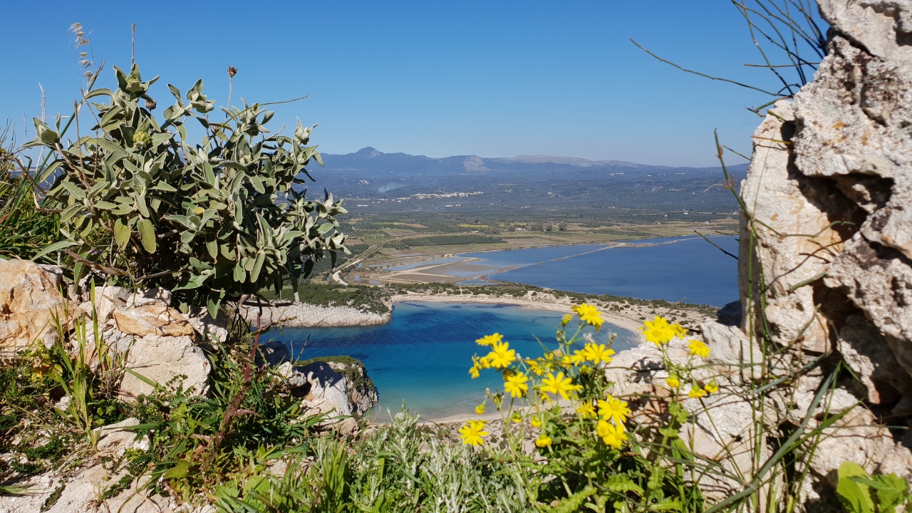 Heute haben wir es kein bisschen eilig. Vertrödeln den Vormittag gemütlich mit den anderen in der Sonne und hören dem Geplauder zu – Geschichten sammeln, bevor wir ab morgen wieder alleine unterwegs sind. Nachmittags machen wir uns dann zu Fuß auf den Weg hoch zur Burgruine, die über der Ochsenbauchbucht thront. So viele Bilder habe ich von hier oben schon gesehen, jetzt will ich endlich selbst über die Buchtenlandschaft in ihren ungezählten Schattierungen von Blau schauen. Und wieder einmal haut mich Griechenland mit seinen Ausblicken um: Den Strand entlang, dann über steile, grün bewachsene Pfade hinauf, überall gelbe, weiße, rote und lilafarbene Blüten im Gras. Vorbei an einer Höhle, deren eine Wand im schummerigen Licht grünlich schimmert. Noch höher hinauf über Felsen bis zur Ruine der Burg – und von dort ein 360 Grad-Panorama, mit dem alle Bilder, die ich davon gesehen habe, nicht mithalten können. Auf der Rückseite der Burg geht es anschließend wieder hinab, noch mehr Blicke, noch mehr Blau, noch mehr Blumen, kurz vor der Bucht sogar Flamingos, die mit ihren langen Beinen durch eine Lagune staksen.